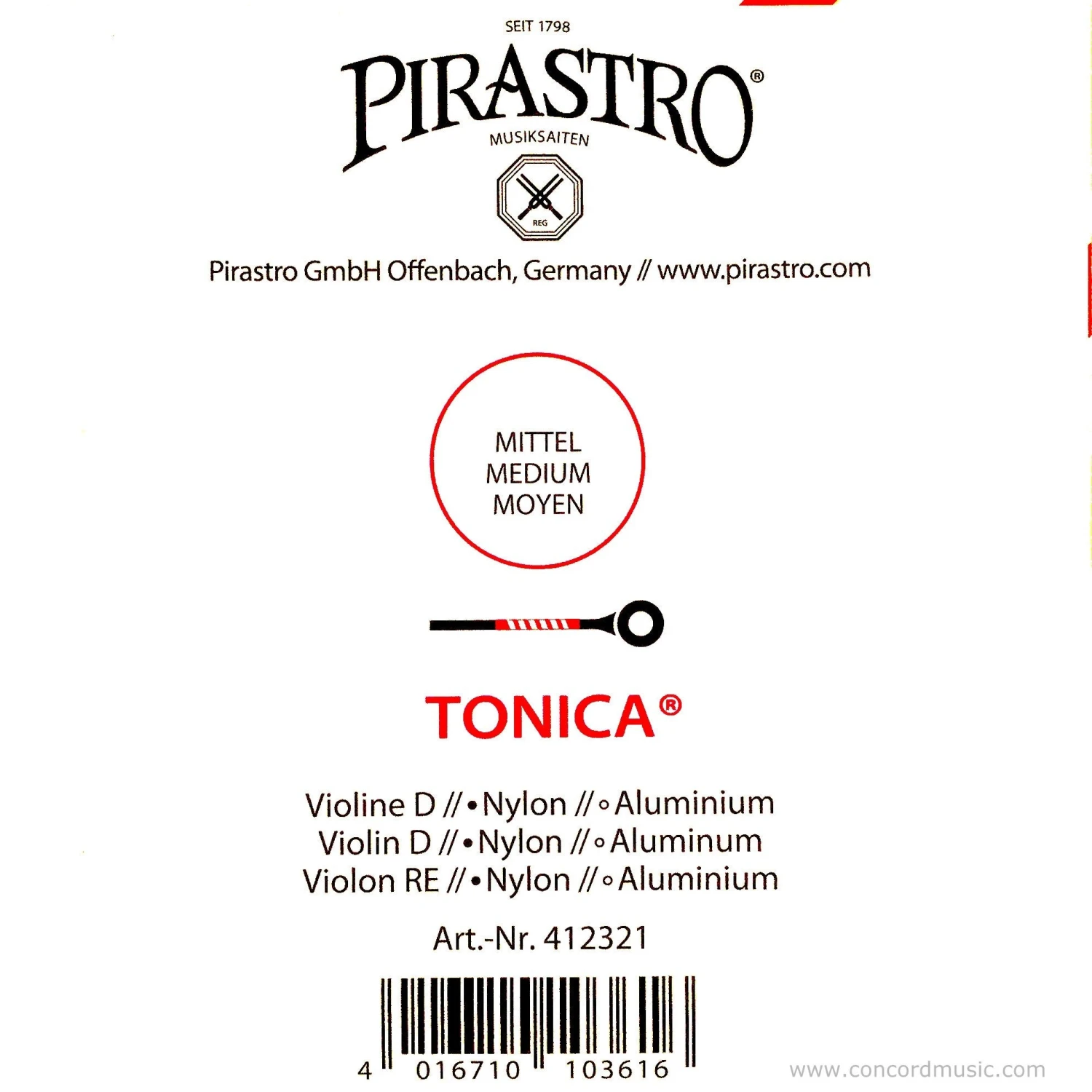 The Tonica D aluminum violin D string has a warmer sound than the silver D string, while maintaining the easy response and tuning stability provided by the Tonica synthetic nylon core. Stark tension available at special price while supplies last.